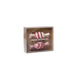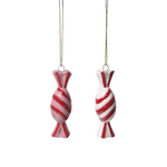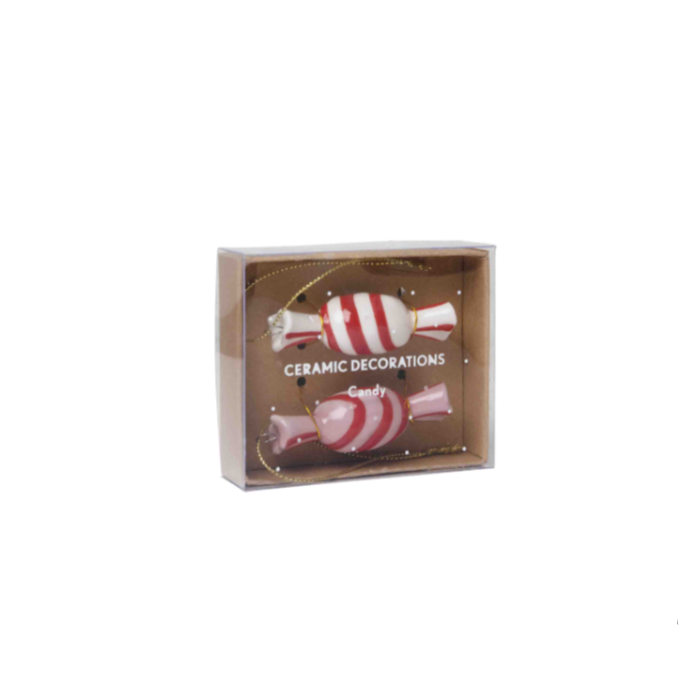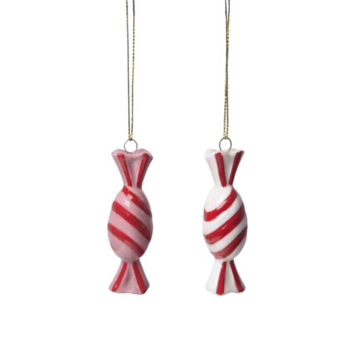 Classic Christmas candies in red and white striped ceramics, perfect for hanging on the tree or as decoration on a package. Sweet nostalgia with a modern finish.