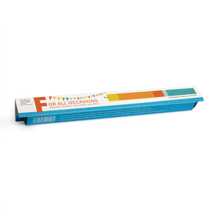 Minimalist and brilliantly coloured, these candles feature colour codes that relate to different aspects of life. Each candle is filled with good wishes and greetings. The candles are handcrafted from dyed, plant-based wax. The packaging, printed and finished in Hamburg on FSC-certified design paper using climate-neutral processes, is bilingual: one side in German, the other in English.