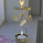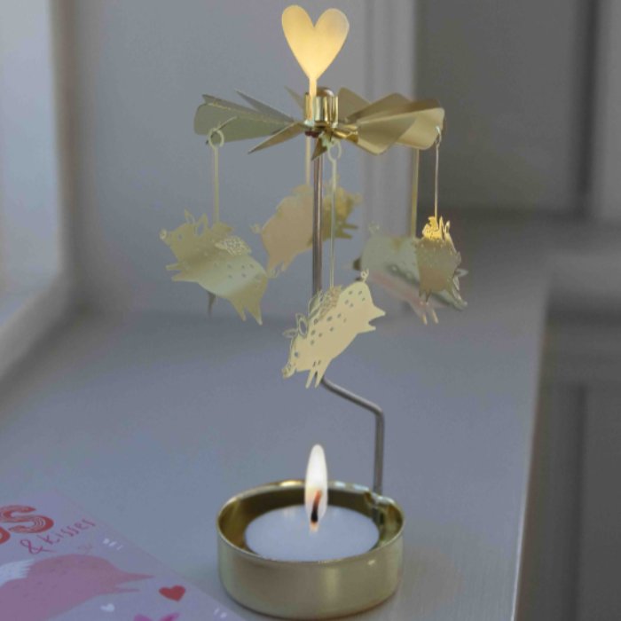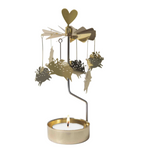 A tea light carousel in gold coloured metal that spins nicely with the heat from the candle.