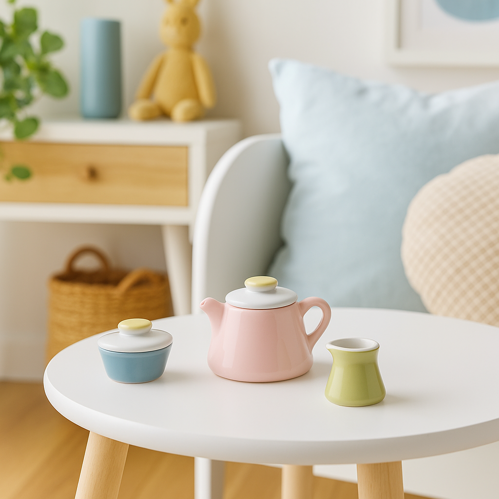 Includes: 1 teapot, 1 sugar bowl and 1 milk jug in pastel colours.