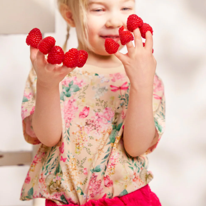 Peachy children’s short-sleeved t-shirt has a straight cut, and the floral Lilacs print with animal friends.