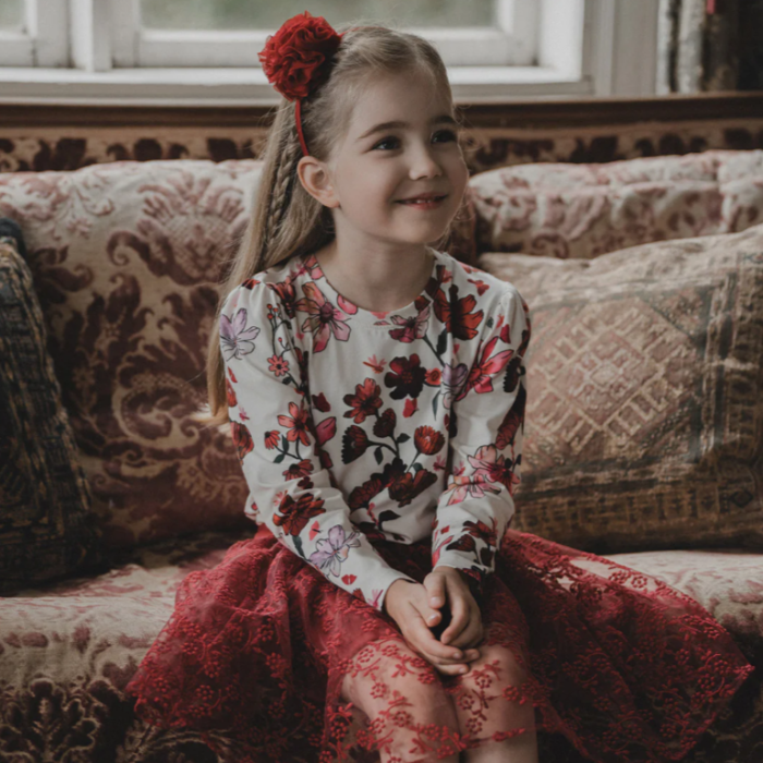 Floral children’s long-sleeved shirt has a widening, longer fit. and it features the Winter garden print.