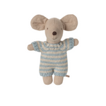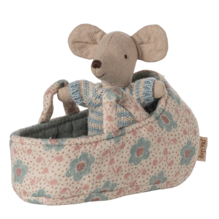 Meet the tiniest adventurer in the Maileg family – the Baby Mouse in Carry Cot Blue. Dressed in a soft striped knitted onesie, this adorable mouse snuggles perfectly into a quilted floral carry cot designed for sweet dreams and playful journeys. With gentle pastel tones and nostalgic charm, it’s an ideal keepsake toy for little ones or a whimsical addition to a Maileg mouse house. Portable, comforting, and endlessly lovable.