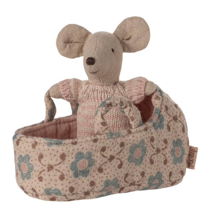 Tuck your tiniest friend in with love. The Maileg Baby Mouse in Carry Cot Rose is a sweet, pocket-sized companion nestled in a soft, floral patterned cot with stitched handles and a cosy quilted lining. Dressed in a delicate knitted onesie, this baby mouse is ready for naps, adventures and endless snuggles. A charming gift and heirloom-quality toy that sparks storytelling and imaginative play, perfect for Maileg dollhouses or on-the-go fun.