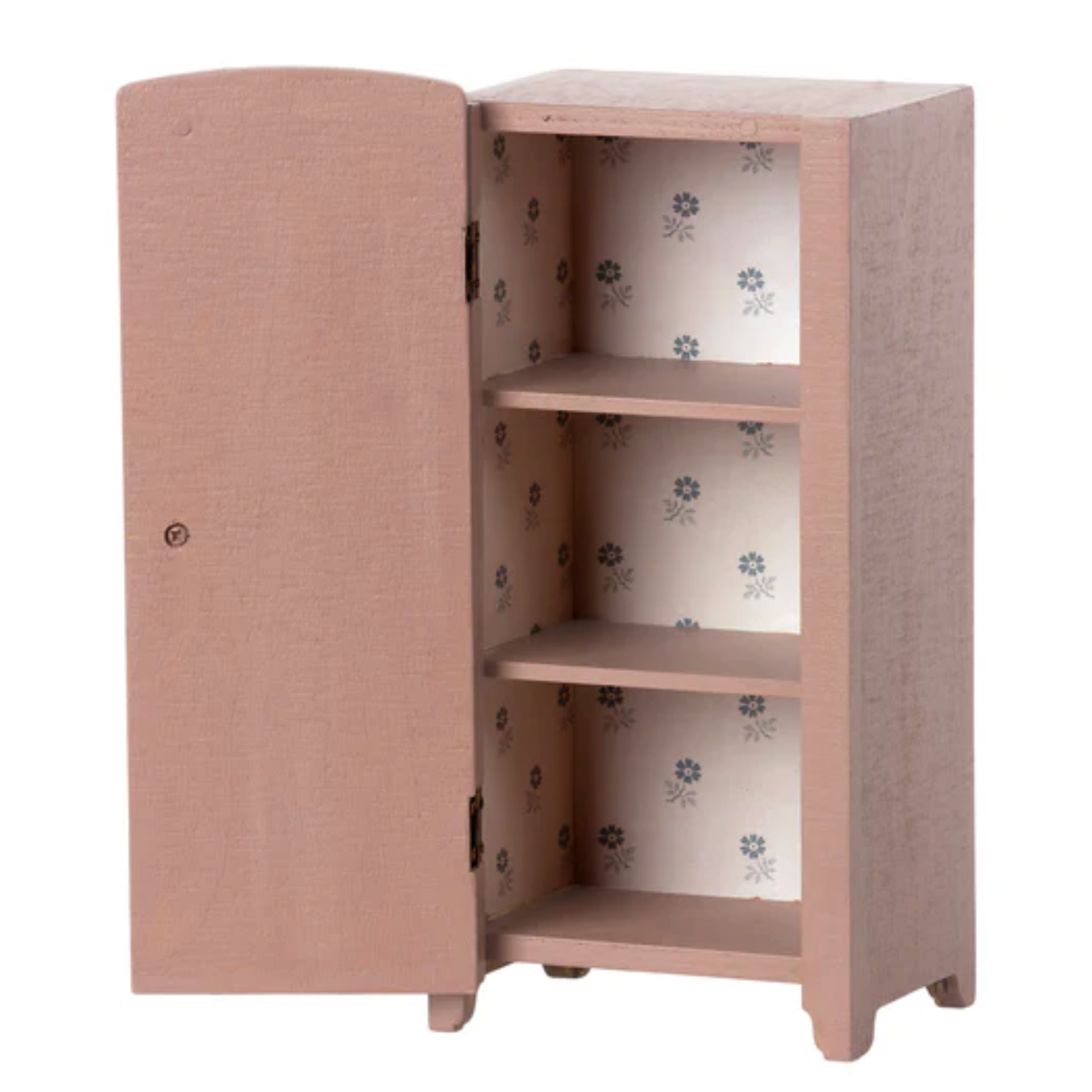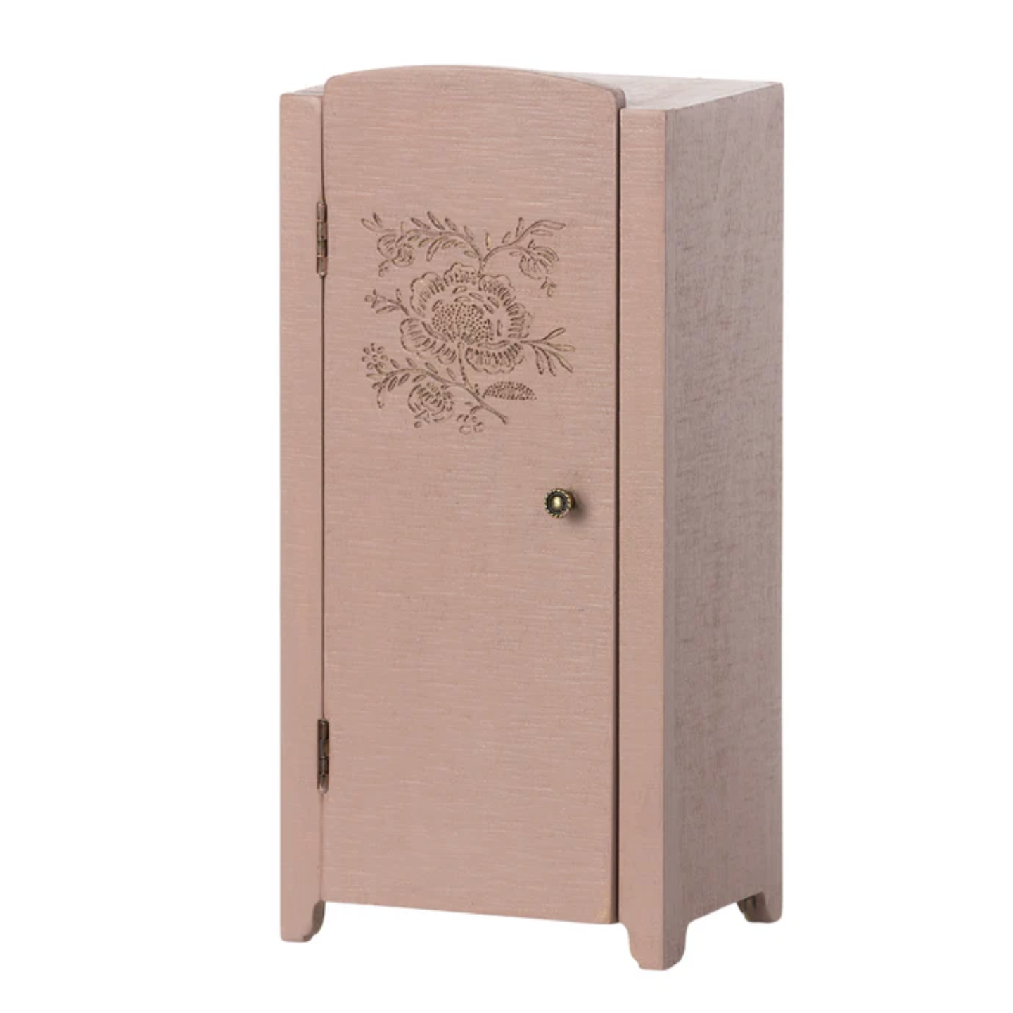 This vintage looking closet has a beautiful embossed flower print on the front and beautiful printed wallpaper inside. The shelves inside will make sure the organizing play will begin. This closet fits into the Maileg House of Miniature Doll's House.