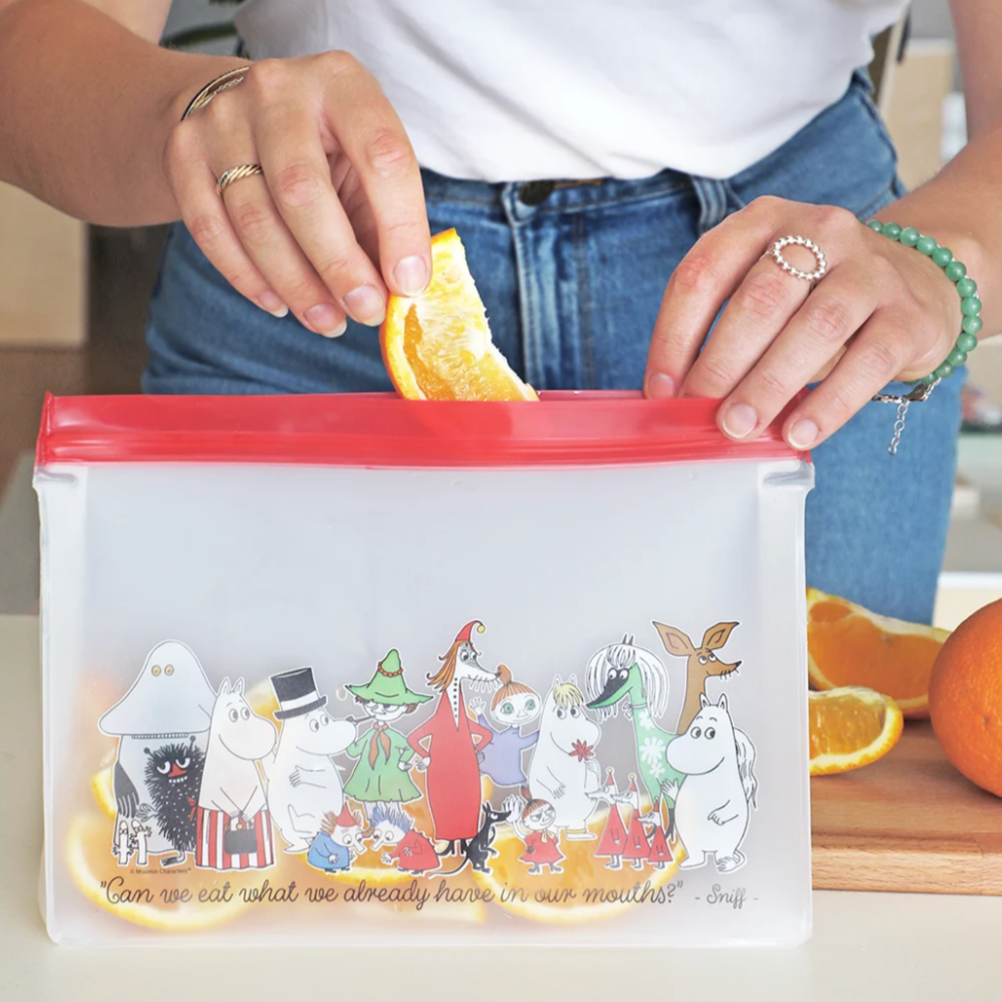 Forget single-use plastic pouches that quickly become waste and store your packed lunch in a reusable pouch. This Moomin-themed pouch is made of PEVA plastic, comes with ziplock closure and measures 26 x 18 x 6 cm. The pouch is freezer-friendly.