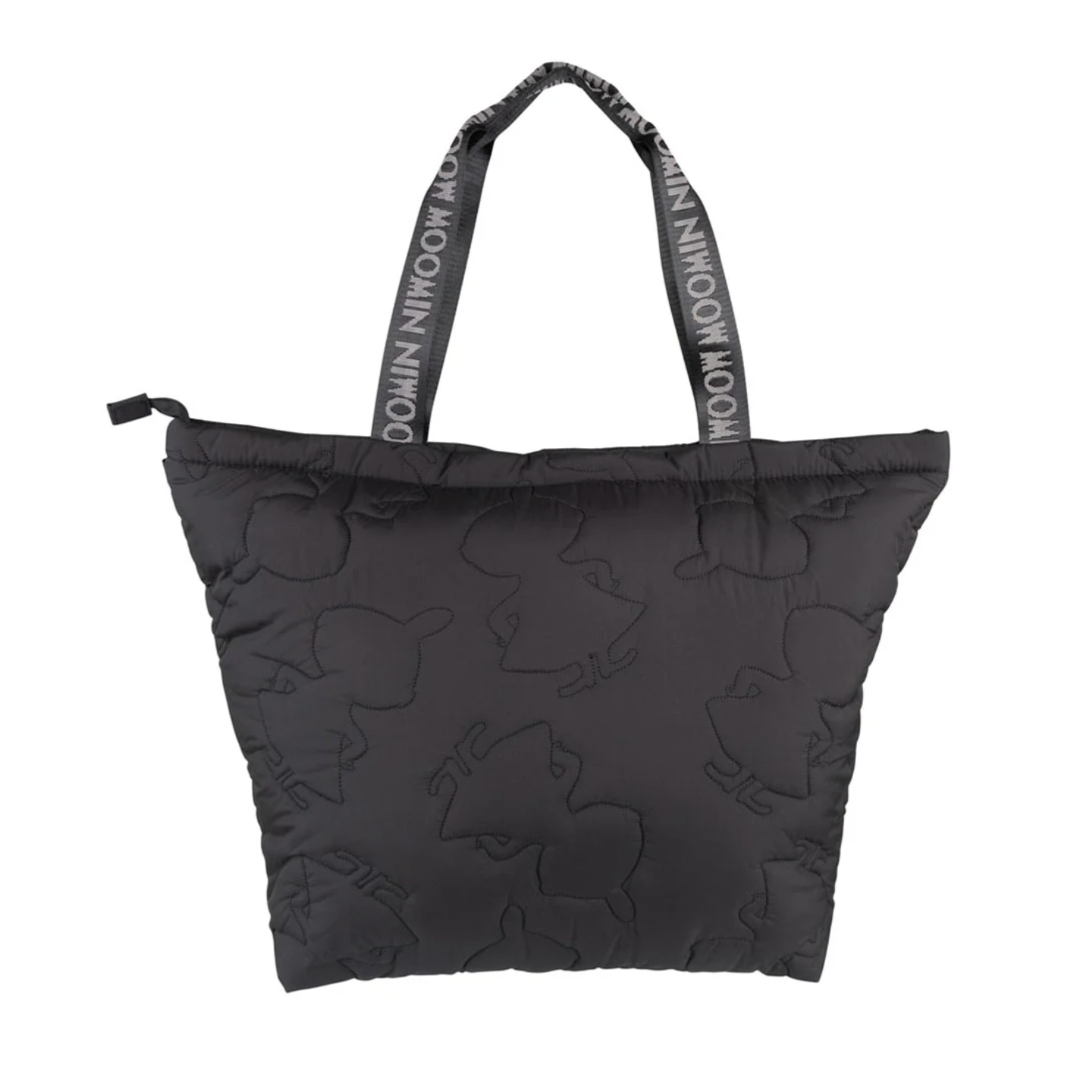 Black Kampsu XL bag is a large shopper bag with a zippre closure, and a sturdy handle. The bag has an inner pocket with a zipper and a boxy bottom that keeps its shape well. The shopper bag is made of quilted fabric, with stitched shapes of Little My. The bag is spacious, comfortable to carry, and it can be used for carrying shopping, library books, gym items, or other important products.