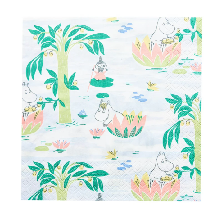 Moomin, Snorkmaiden and Little My pick fruits and float atop water lilies on these serviettes.