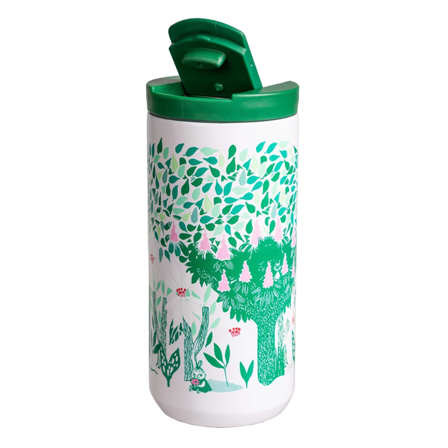 Moomin-themed thermos mug with a volume of 4,5 dl. The thermos mug has a green lid, and the atmospheric Spring Chestnut print in shades of pink and green. This mug is perfect for those who prefer to drink their drinks on the way to work, school, or errands.