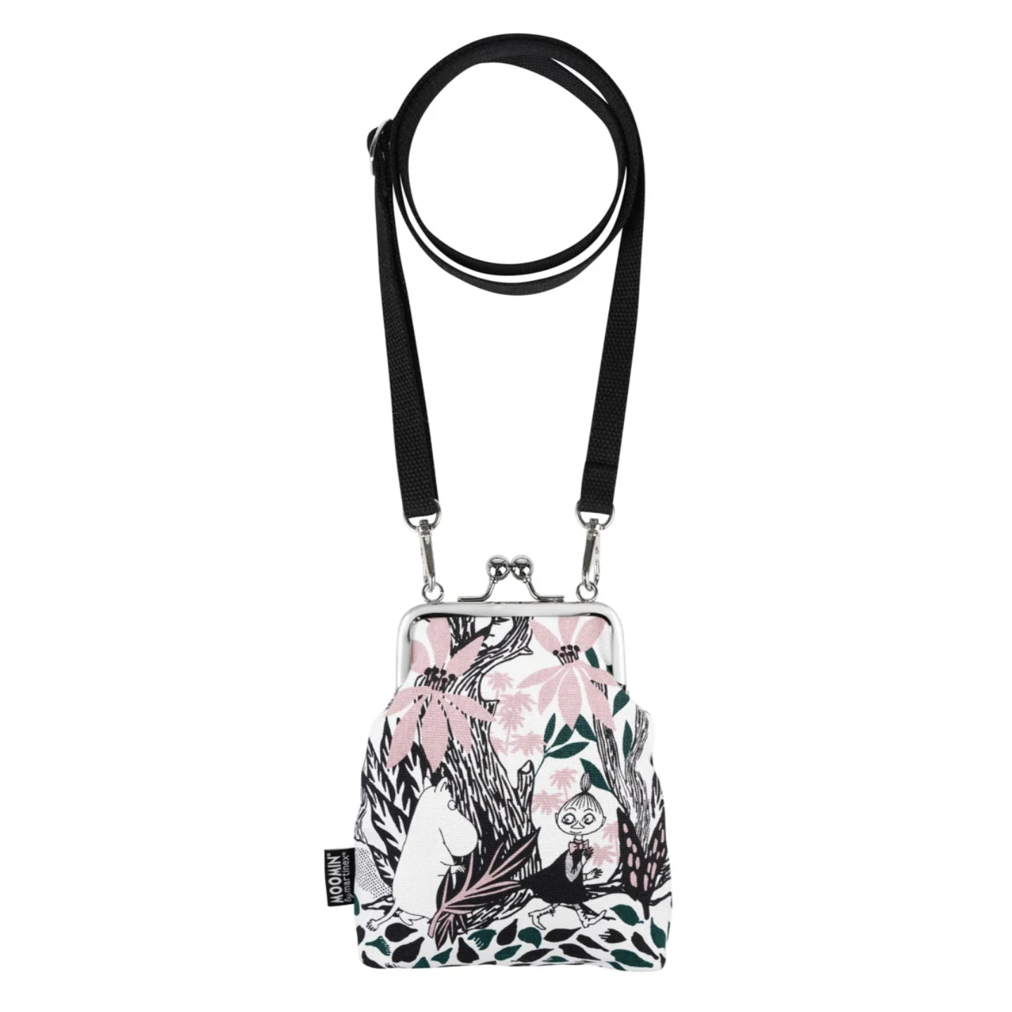 Colourful Vinssi+ pouch bag has a metallic frame and a handy closing mechanism. The pouch bag with a strap is perfect for small items, such as a phone or a wallet, in everyday life and festive moments. The shoulder bag has the atmospheric Spring Chestnut print, in shades of pink and green, inspired by The Moomins and the Great Flood book by Tove Jansson.