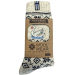 The wool socks have a beautiful Nordic ice star pattern and a beautiful white "SWAN" icon with a small woven Finnish flag.